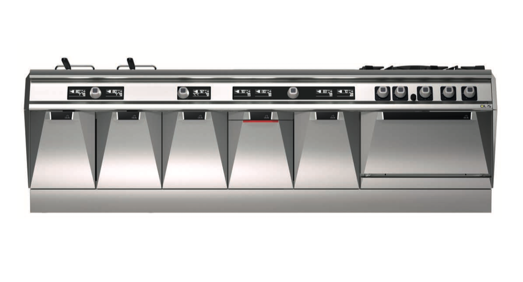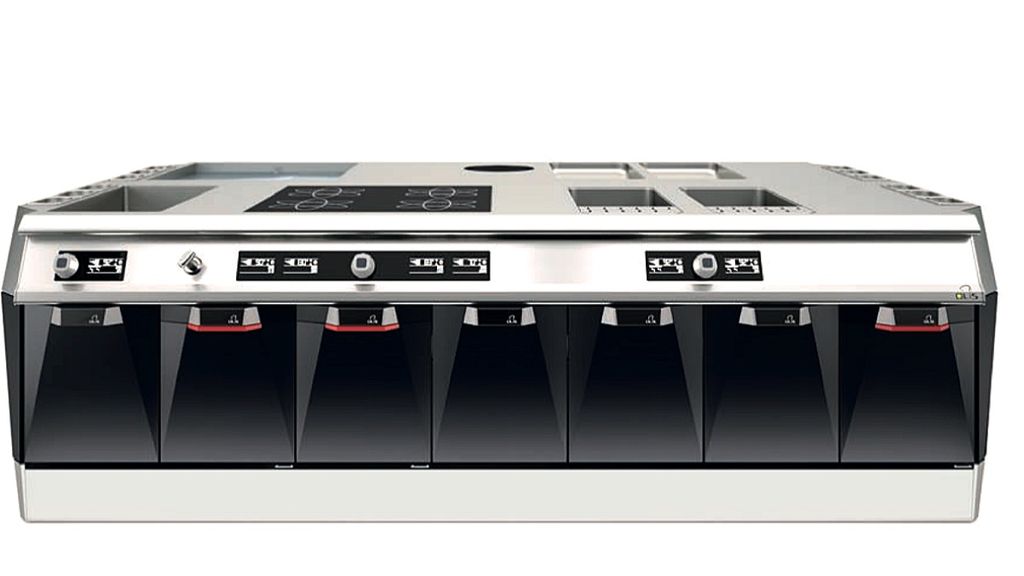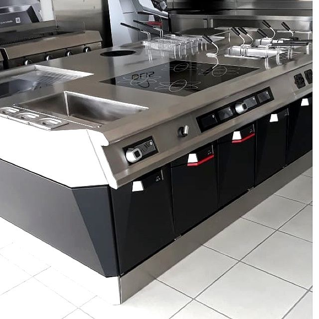 Спецификация: 4-х зонная индукция, жарочная поверхность, фритюр 2 ванны, пастобойлер, ванна мармит, вог плита, 2 душирующих устройства телескопических с разных сторон.
